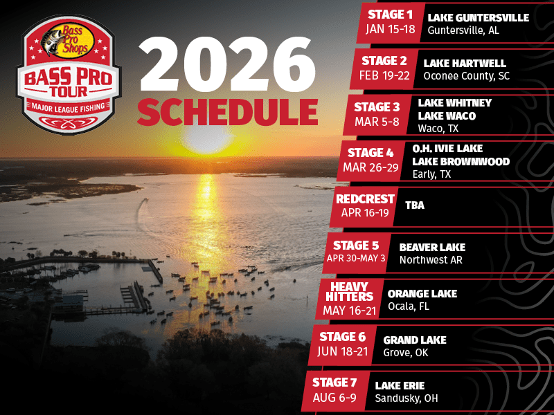 | BENTON, Ky. (July 9, 2025) – Major League Fishing (MLF) announced today the 2026 Bass Pro Tour schedule, ushering in a new chapter for the sport’s premier professional bass fishing circuit. Featuring a roster of 51 pros, the 2026 season will spotlight some of the country’s most diverse fisheries and record-setting payouts as the field competes for Fishing Clash Angler of the Year honors and qualification into REDCREST 2027 and the MLF Heavy Hitters all-star event. The new season kicks off January 15 at Lake Guntersville in Alabama and winds through fisheries in South Carolina, Texas, Arkansas, Florida, Oklahoma and Ohio, introducing multiple new venues and back-to-back dual-lake events that will push competitors to the limit. “Our 2026 schedule showcases everything we love about the Bass Pro Tour – challenging new waters, high-stakes competition and a roster of the most accomplished anglers in the sport,” said Kathy Fennel, MLF Executive Vice President & General Manager. “We’re especially excited about several new stops on the Tour next season, and working on some exciting developments for REDCREST 2026, which we’ll be announcing soon. There’s never been a better time to be a fan of the sport of professional bass fishing.” A key storyline entering the 2026 season is the Bass Pro Tour’s transition to a 51-angler field – the final step in a strategically planned two-year restructuring of the league’s competitive format. The next evolution is designed to create a more streamlined, sustainable model that elevates the profile of each competitor, improves storytelling for fans and sponsors and maximizes the league’s evolving digital broadcast strategy. As in 2025, each Bass Pro Tour event will feature the full field of anglers competing in the Qualifying Round on Days 1 and 2, followed by the Knockout Round on Day 3 and then the Championship Round on Day 4. The league’s signature catch-weigh-release format ensures immediate fish care and maximum fan excitement, with every fish scored and streamed live on MLFNOW! via the MLF app, MyOutdoorTV (MOTV), Rumble, and at MajorLeagueFishing.com. With fresh lakes and a field of the world’s best anglers ready to make history, the 2026 Bass Pro Tour promises more action, more surprises and more big bass moments than ever before. 2026 MLF Bass Pro Tour Schedule: Jan. 15-18: Stage 1 at Lake Guntersville Guntersville, Ala. Hosted by Marshall County Tourism & Sports Feb. 19-22: Stage 2 at Lake Hartwell Oconee County, S.C. Hosted by Visit Oconee SC March 5-8: Stage 3 at Lake Whitney (Days 1-2) & Lake Waco (Days 3-4) Waco, Texas Hosted by the Greater Waco Sports Commission, the City of Waco and the Waco TPID March 26-29: Stage 4 at O.H. Ivie Lake (Days 1-2) & Lake Brownwood (Days 3-4) Early, Texas Hosted by Visit Early April 16-19: REDCREST 2026 TBA April 30-May 3: Stage 5 at Beaver Lake Northwest Ark. May 16-21: MLF Heavy Hitters at Orange Lake Ocala, Fla. Hosted by the Ocala/Marion County Visitors & Convention Bureau June 18-21: Stage 6 at Grand Lake Grove, Okla. Hosted by the City of Grove and the Grove Convention & Tourism Bureau Aug. 6-9: Stage 7 at Lake Erie Sandusky, Ohio Hosted by Shore & Islands Ohio Proud sponsors of the MLF Bass Pro Tour include: 7Brew Coffee, Abu Garcia, Athletic Brewing Co., Bass Force, B&W Trailer Hitches, Bass Pro Shops, Berkley, BUBBA, E3 Sport Apparel, Fishing Clash, Grizzly, Lowrance, Mercury, MillerTech, NITRO Boats, O’Reilly Auto Parts, Power-Pole, Ranger Boats, Rapala, Star brite, Suzuki Marine, Toyota and Zenni. For complete details and updated information on Major League Fishing and the 2026 Bass Pro Tour, visit MajorLeagueFishing.com. For regular updates, photos, tournament news and more, follow MLF’s social media outlets at Facebook, X, Instagram and YouTube. |