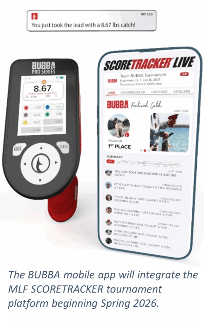 (Columbia, MO & Benton, KY) July 14, 2025 – BUBBA, a leading fishing brand known for its mobile fishing app and innovative Smart Fish Scales, and Major League Fishing (MLF), the world’s largest tournament-fishing organization, have partnered to bring seamless tournament hosting capability and the thrill of live scoring to anglers, organizers and fans everywhere by integrating MLF SCORETRACKER® technology into the BUBBA app to create SCORETRACKER LIVE, beginning Spring 2026.