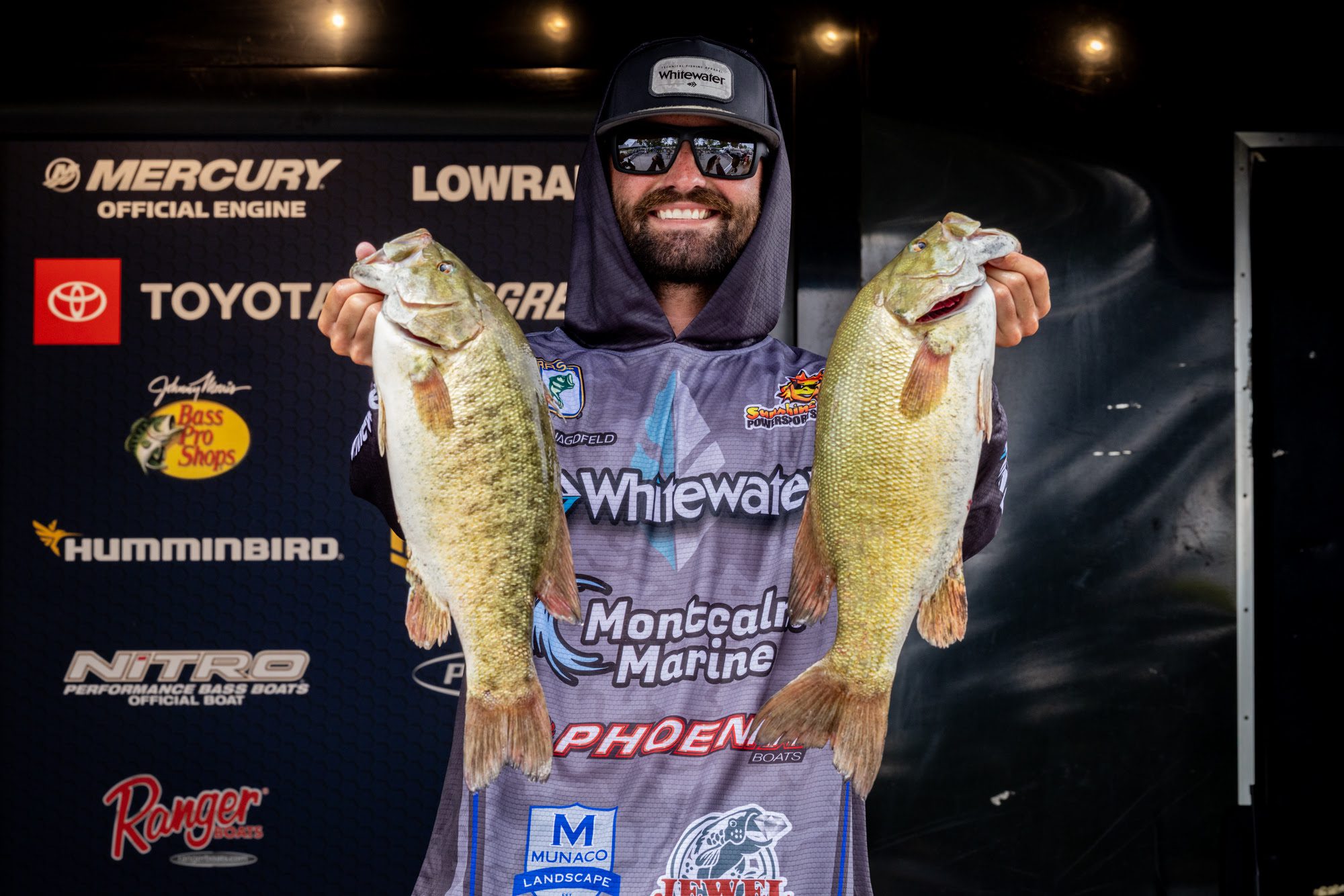 The 24-year-old made the 130 round-trip trek to Lake St. Clair to land 23 pounds, 5 ounces of smallmouth to take the Day 1 lead, anchoring his bag with a 5-7 to take control of Big Bass of the Tournament.