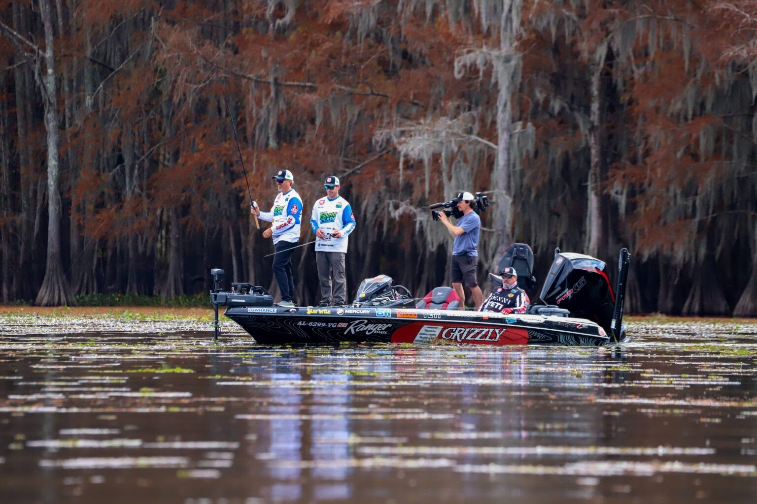 Overall, there were 63 bass weighing 123 pounds, 12 ounces caught by the four teams Tuesday in Knockout Round Match 3 on Caddo Lake. Team Fishing Clash pro Ron Nelson and Team YETI pro Jeff Sprague both caught largemouth bass weighing in at 3 pounds, 12 ounces, to share the Berkley Big Bass of the Day honors.