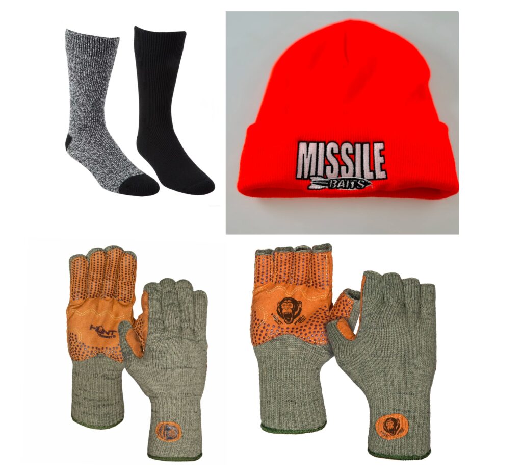 The hands are next. A lot of people can do fine without gloves, but not me. I love the Fish Monkey Wooly gloves, and especially the fingerless model. But the tips of your fingers will get cold and I may have to opt for the full finger. But you can have the fingerless and another pair of gloves you can slide over them if it gets too cold, or you just want to warm them up for a few minutes. I like fingerless so I can still feel my rod and line, depending on what bait you are using, and for handling the big girls I catch during the cold days of winter.