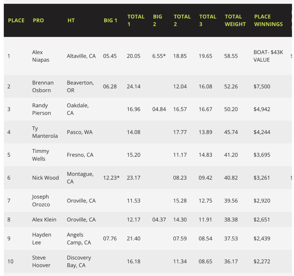 Randy Pierson of Oakdale, Calif. rounded out the top trio, posting a three-day total of 50.20. The result stood in sharp contrast to his pre-event days on the water that left him uncertain heading into the event.