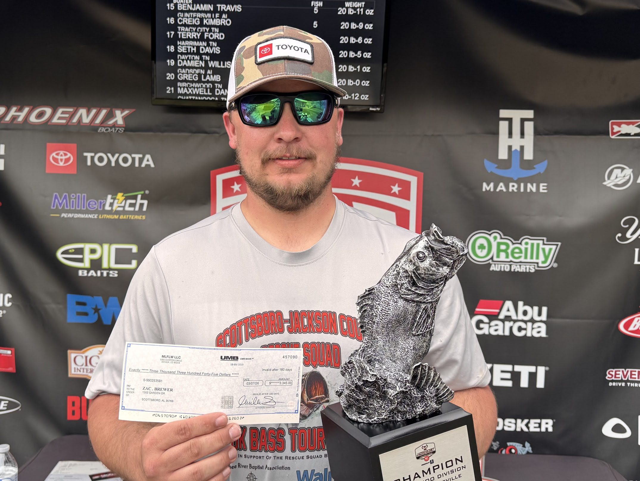 Zac Brewer of Scottsboro, Alabama, won the co-angler division and the top prize of $3,345 Saturday after bringing three bass to the scale that totaled 14 pounds, 13 ounces.