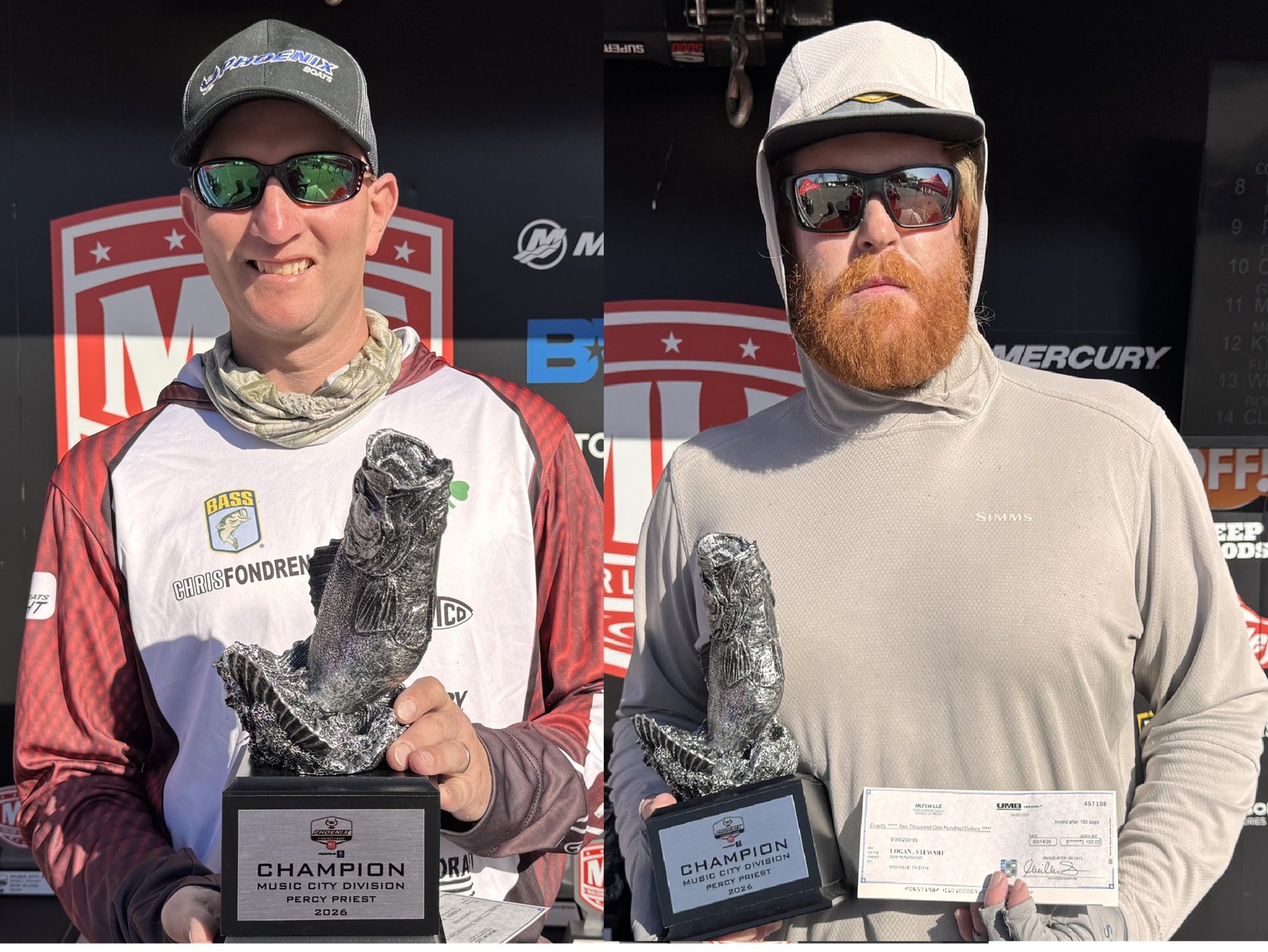 ANTIOCH, Tenn. (March 16, 2026) – Boaters Chris Fondren of Lebanon, Tennessee, and Logan Stewart of Nashville, Tennessee, each caught five bass weighing 19 pounds, 8 ounces, to tie for the win at the MLF Phoenix Bass Fishing League (BFL) Presented by T-H Marine on Percy Priest. The tournament was the first of five events of the season for the BFL Music City Division. Fondren earned $9,100, including a $7,000 Phoenix bonus, and Stewart earned $2,200.
