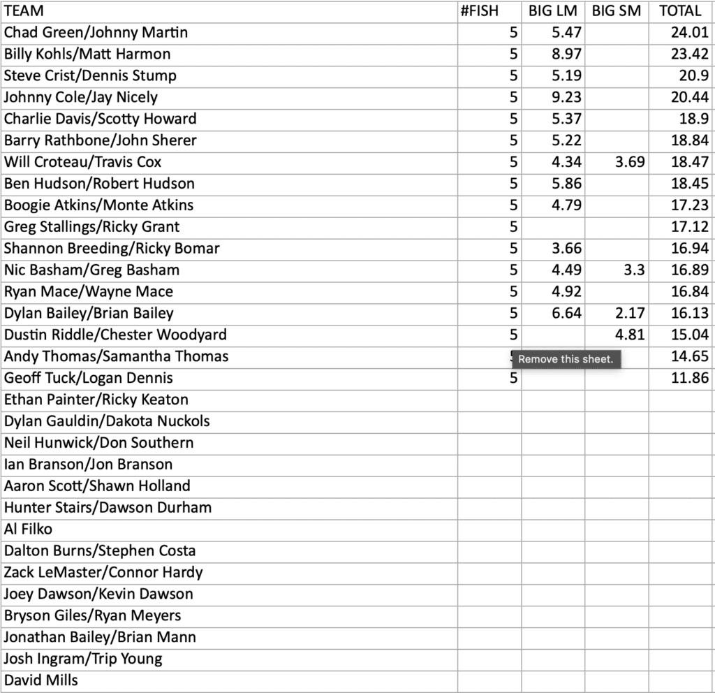 Oh, what a difference a day makes for a lot of the anglers who fished on Smith Mountain Lake this weekend. But the weights were sill strong & the giants were still there as you can see by the photos. Congratulations to today’s winners, Chad Green & Johnny Martin.