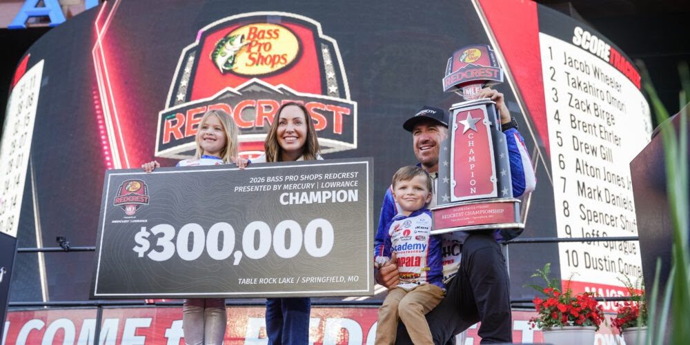 SPRINGFIELD, Mo. (April 19, 2026) – With 2 ½ hours left to fish in Bass Pro Shops REDCREST Presented by Mercury & Lowrance, Jacob Wheeler sat on the front deck of his bass boat and made a phone call. Trying to distract himself from the fact that the $300,000 prize and REDCREST trophy that had long eluded him were within reach, Wheeler FaceTimed his wife, Alicia, and their two children, Olivia and Hudson, during the final period break.