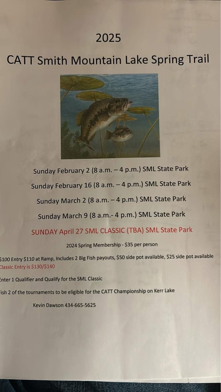 CATT Team Smith Mountain Lake Team schedule for Spring 2025. Fish one qualifier to enter SML final. Fish any 2 tournaments to fish the 2 day championship at Buggs in May 2025. Spring membership is $35 per person. Tourneys will be $100 in advance and $110 at the ramp. Two sidepots this spring, $50 and $25 (both are optional). Big largemouth and big smallmouth paid at each event. Hopefully the weather will cooperate and look forward to seeing you next year!