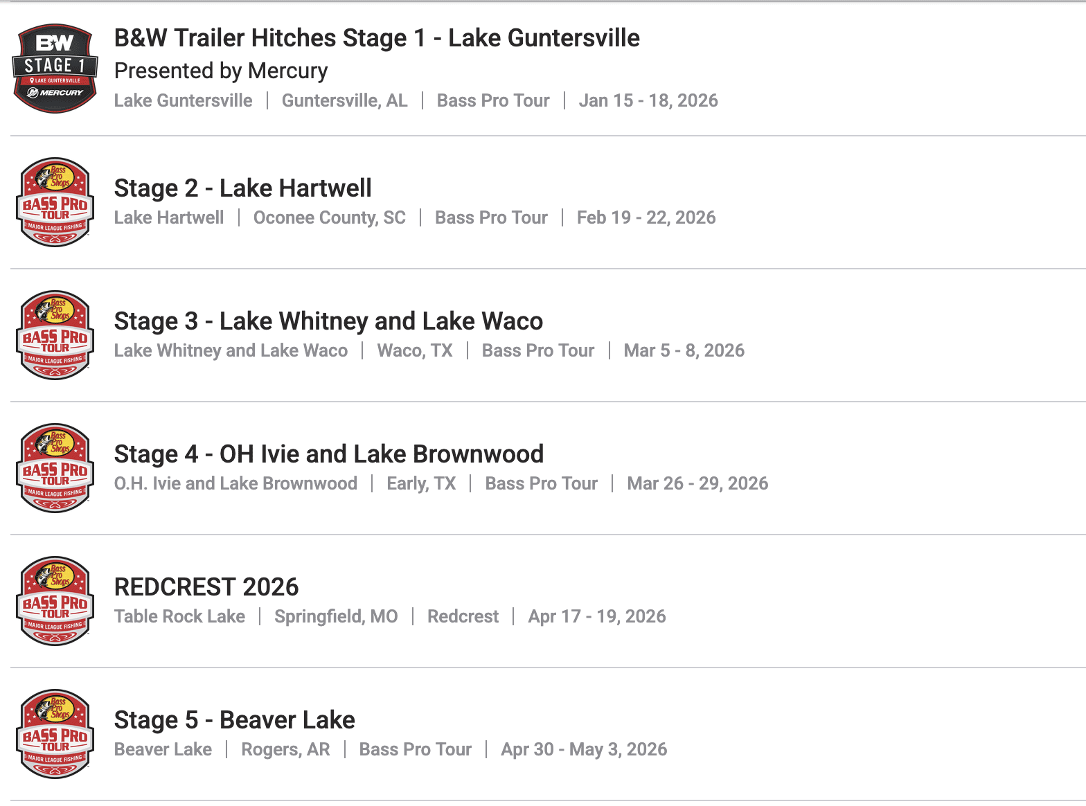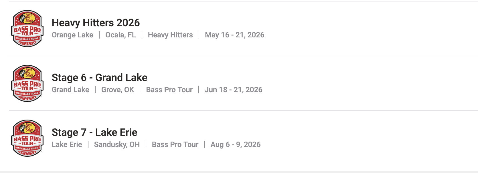 MLF Bass Pro Tour – Lake Erie – Aug 6th – 9th By Brian Carter - August 6, 2026 0 69 FacebookTwitterPinterestWhatsApp Map Unavailable Date/Time Date(s) - August 6 - August 912:00 am Categories Major League Fishing Bass Pro Tour