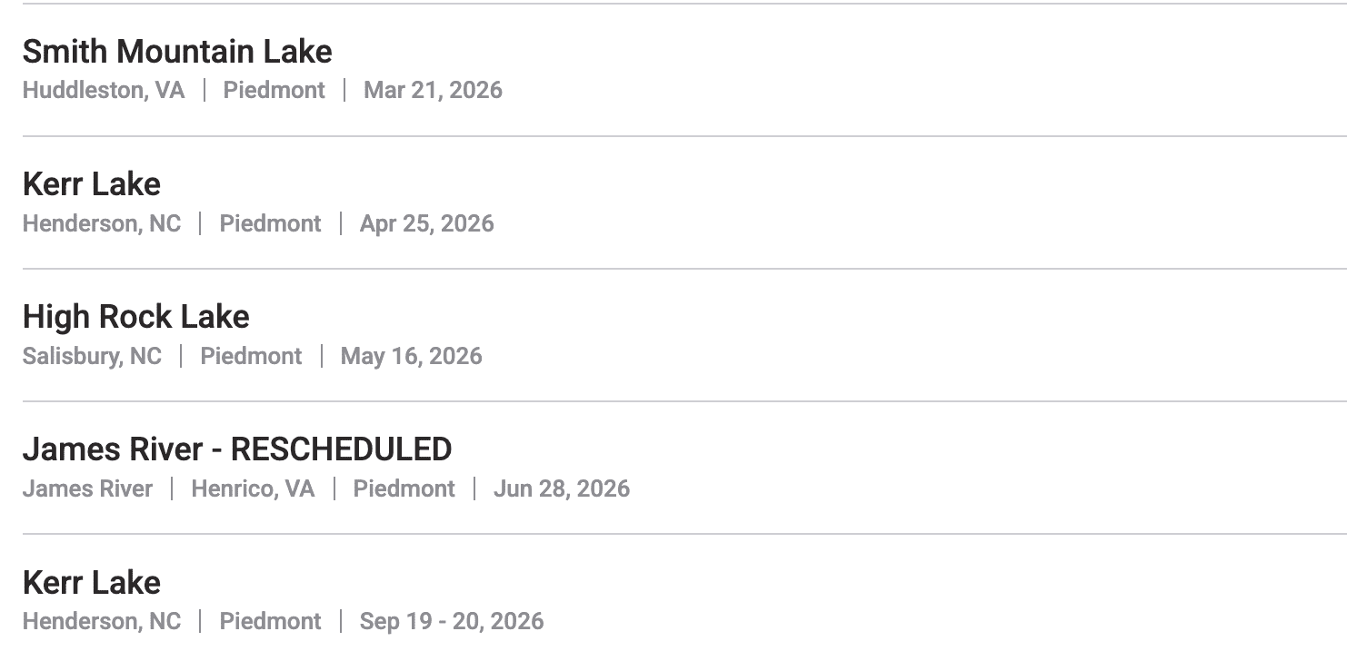 MLF/BFL – Piedmont Division – Smith Mountain Lake – Mar 21st By Brian Carter - March 21, 2026 0 91 FacebookTwitterPinterestWhatsApp Map Unavailable Date/Time Date(s) - March 2112:00 am Categories BFL VA Piedmont Division VA Schedules